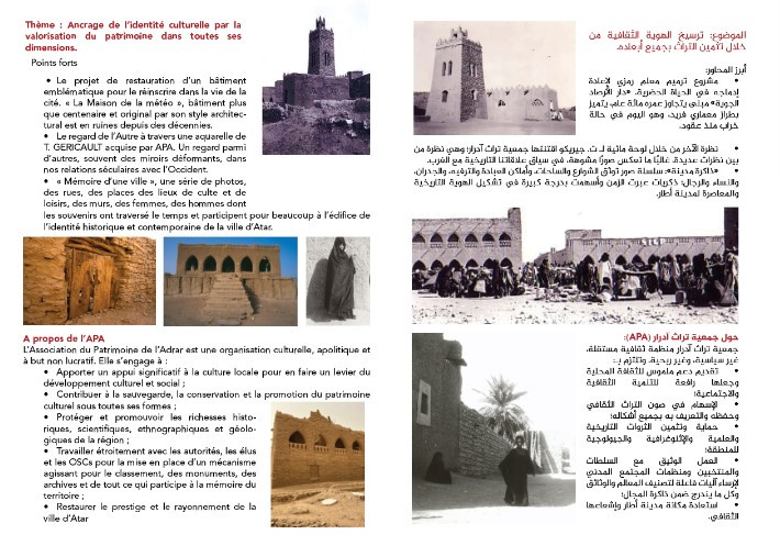سجّلت جمعية تراث آدرار APA حضورًا متميزًا في مهرجان مدائن التراث، من خلال عرض نوعي عكس عمق الذاكرة المحلية وغنى الرصيد التاريخي لمدينة أطار، وجسّد رؤية واعية تقوم على مواجهة الزمن والنسيان بالحفظ والتوثيق والإبداع. وقد نال هذا العرض استحسان الزوار والمتابعين، لما اتسم به من جودة في المحتوى وحسن في الإخراج ودقة في الرسالة الثقافية.